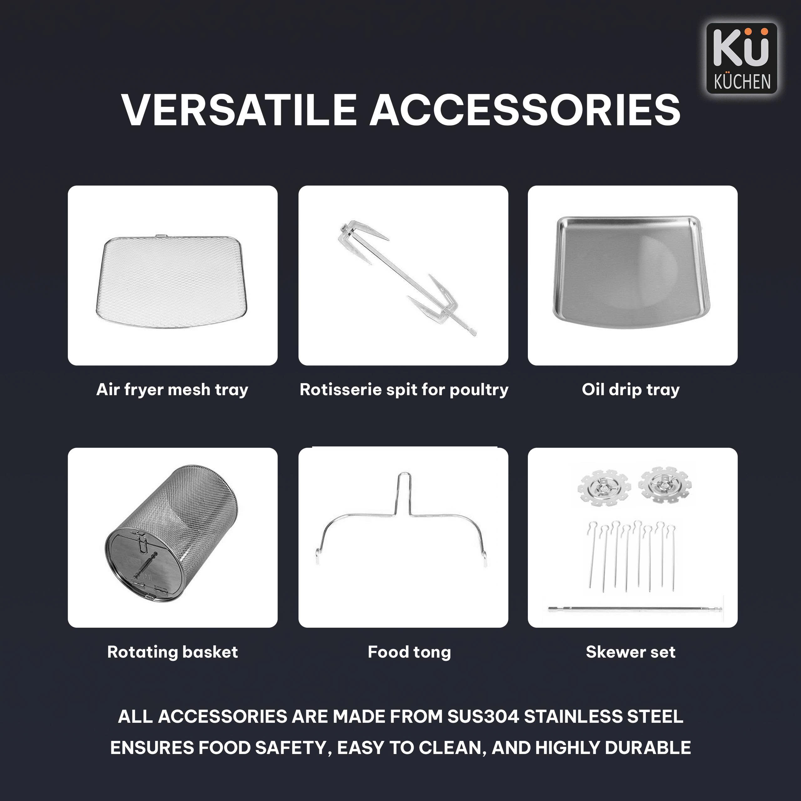 • Includes versatile accessories: rotisserie, skewers, mesh tray, and tongs.