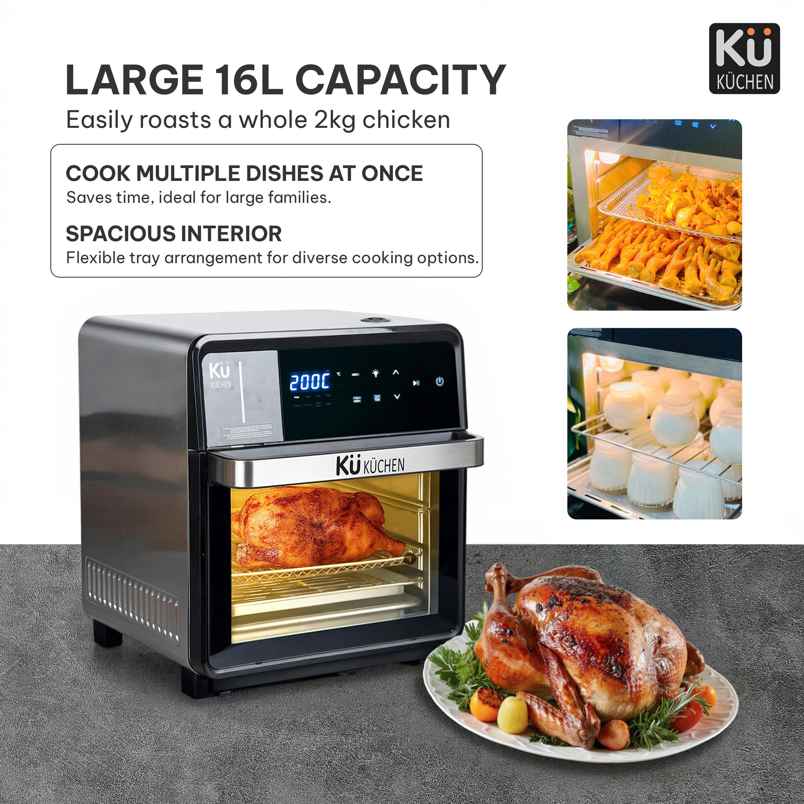 • Huge 16L capacity – roast a whole chicken, fish, or 10-inch pizza with ease