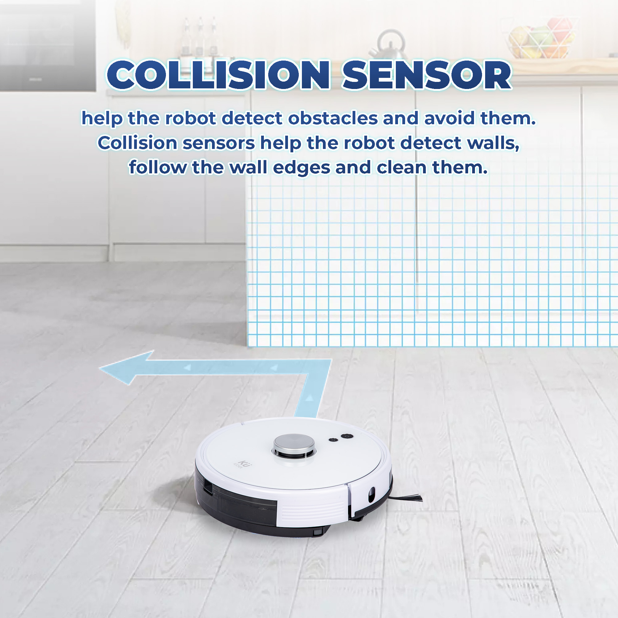 Height sensors prevent falls and protect the device. Collision sensors help the robot detect obstacles and avoid collisions. It also detects walls, following edges for maximum cleaning.