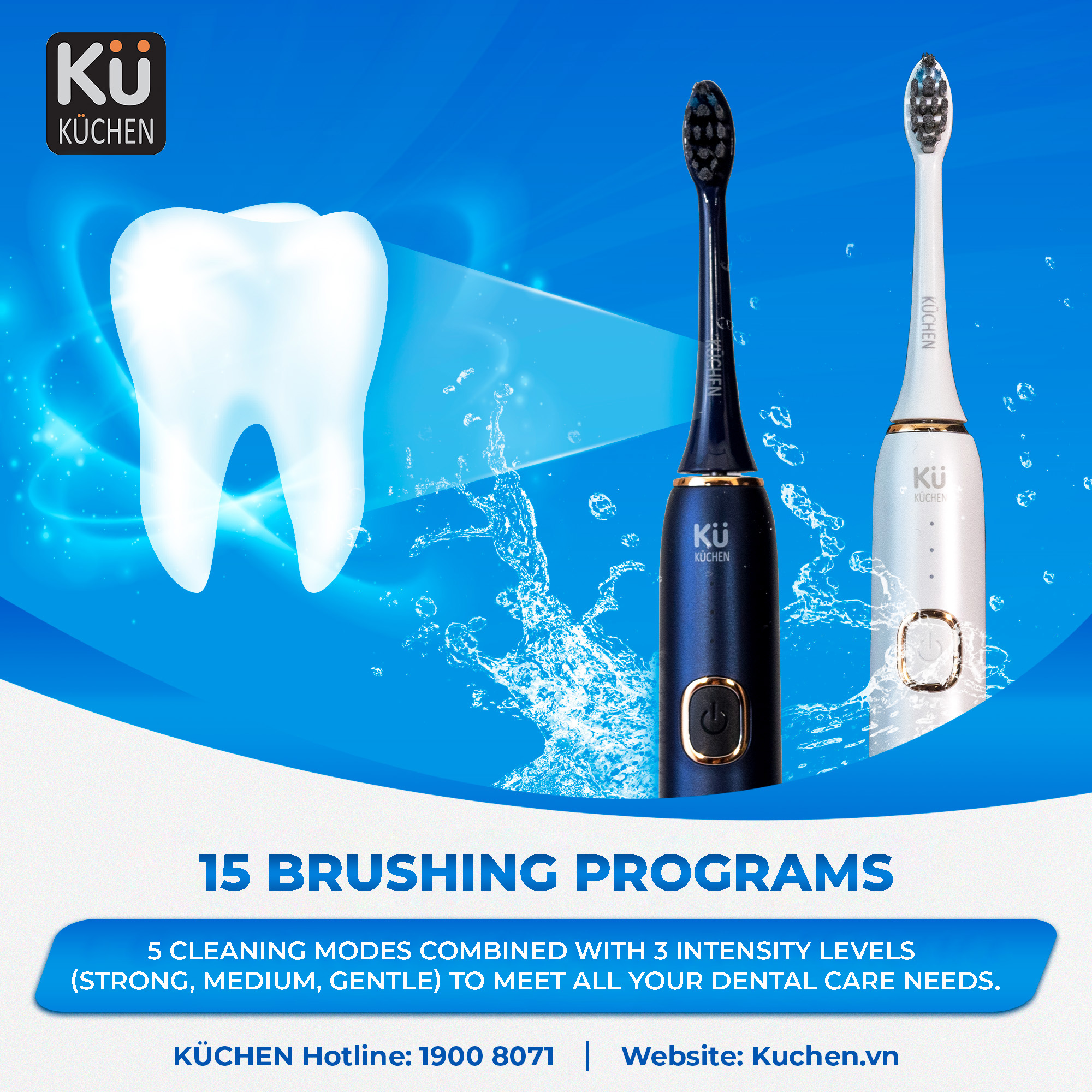 • 15 brushing programs with 3 intensity levels for personalized oral care