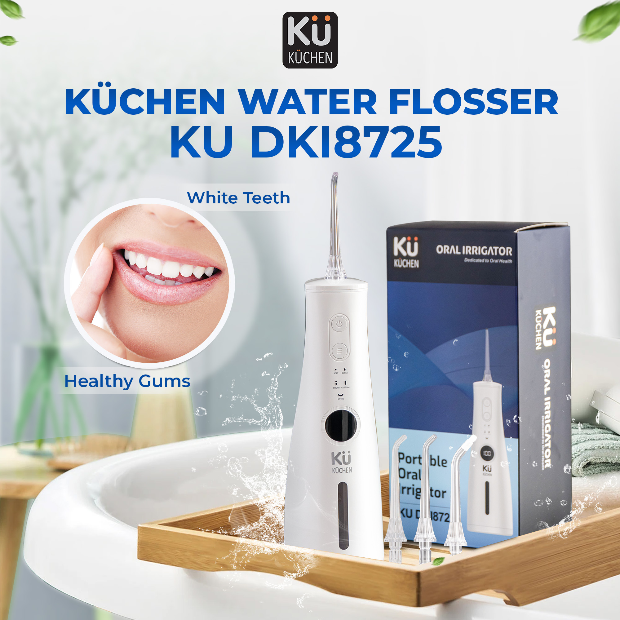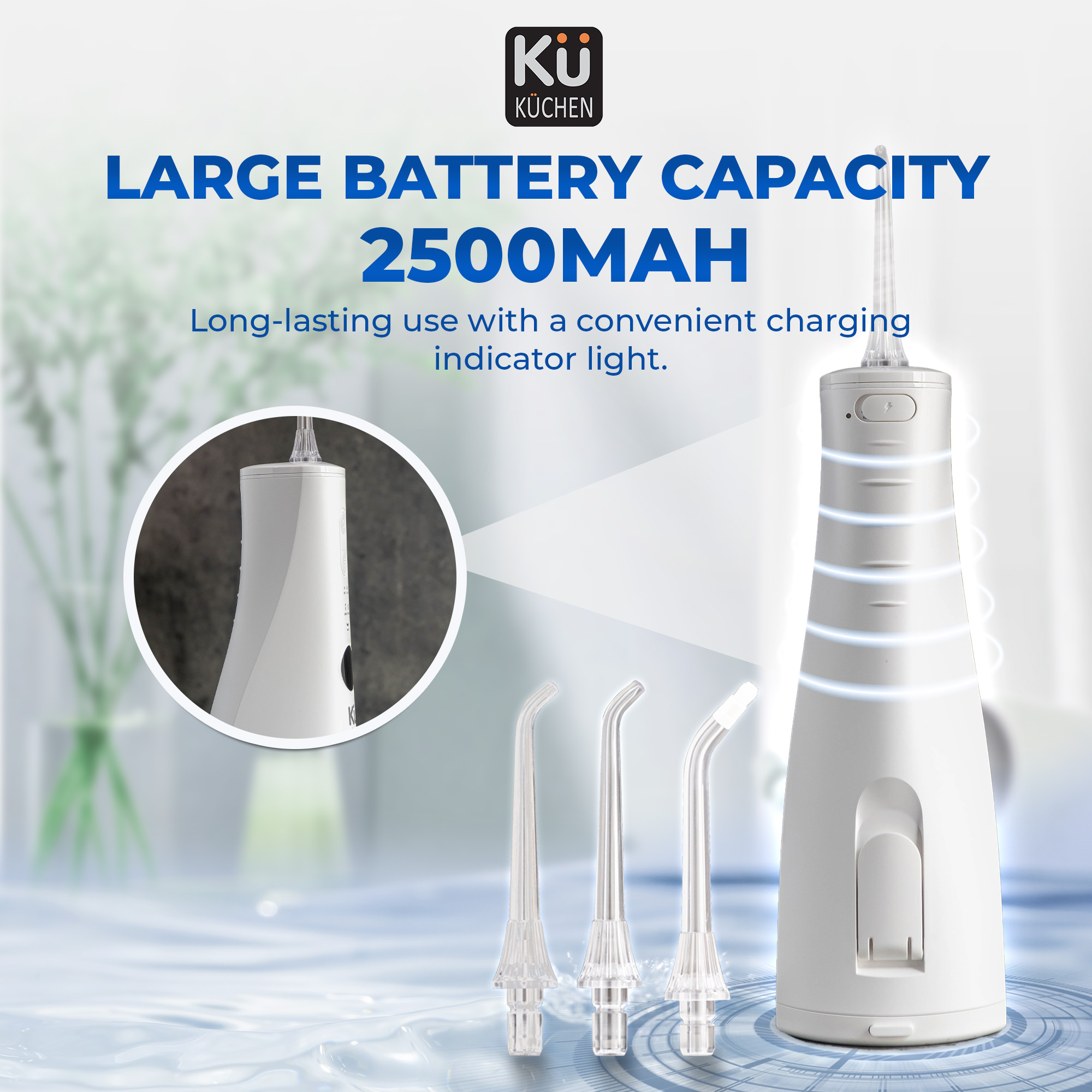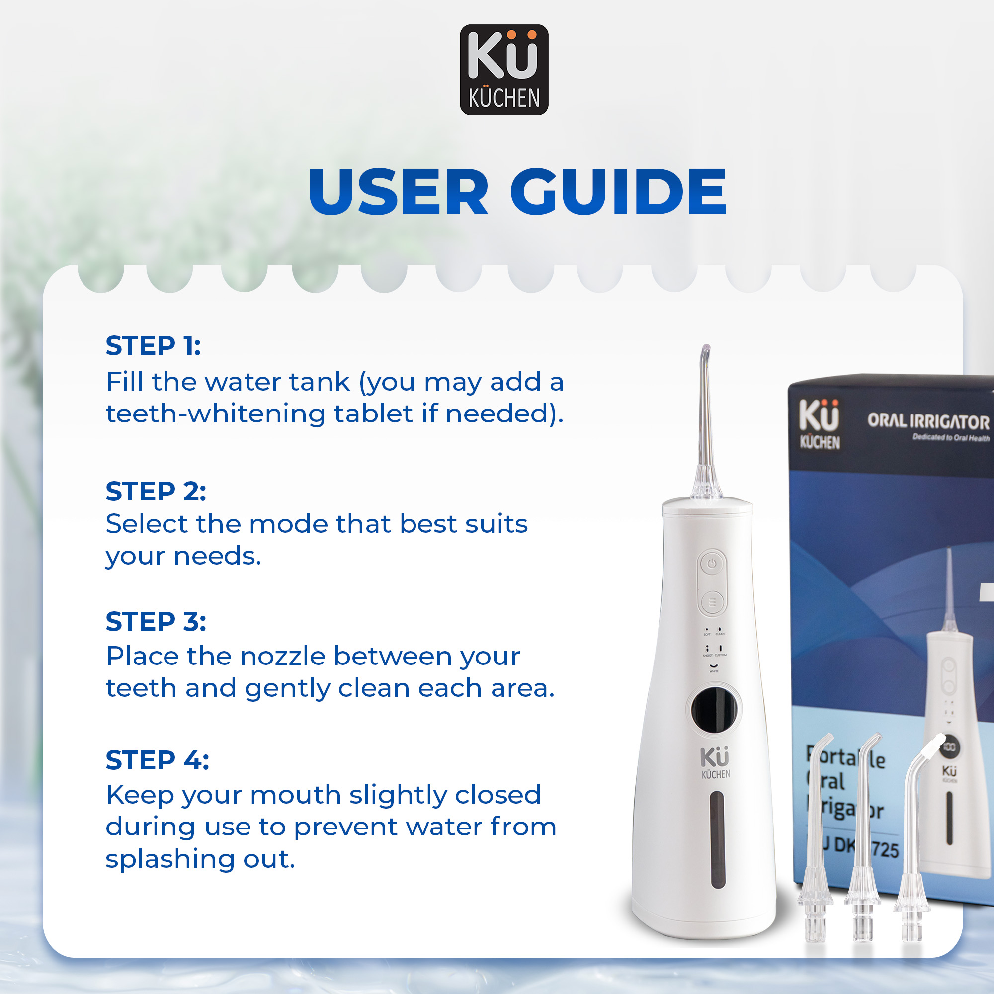 Complete Set: Cordless flosser, charging cable, 3 nozzles, user manual.